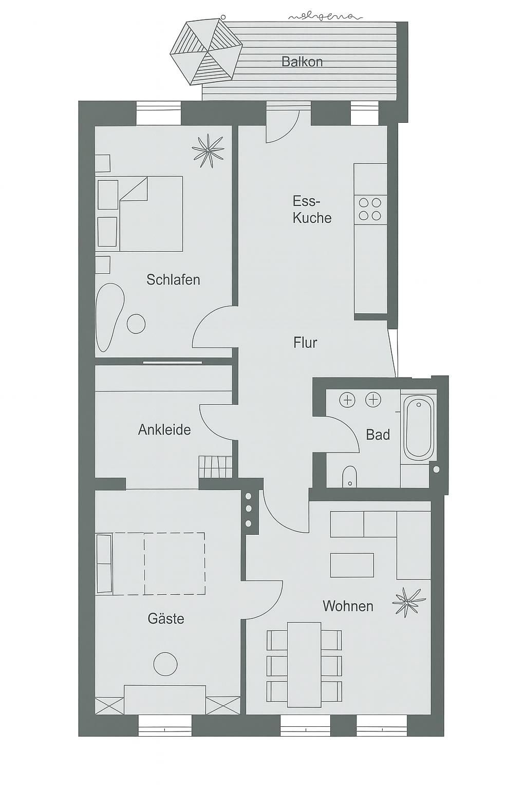 Alle Zimmer mit schönen Fenstern und viel Licht, einer durchdachten Raumaufteilung und einem wunderbaren Balkon.